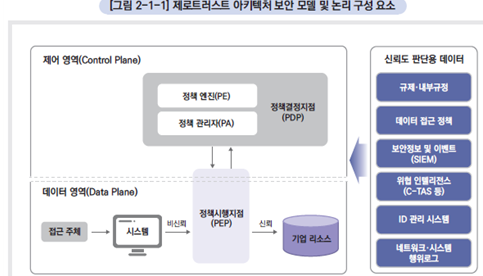 ZTA 보안모델은 제어 영역과 데이터 영역으로 구분되며 이 아키텍처를 실현하기 위해서는 앞서 언급한 접근 주체가 리소스에 대해서 접근하는 것에 대한 정책에 대해 다루어야 한다. 제어 영역은 접근제어 정책이 결정되는 논리적 공간을 말하며 데이터 영역은 정책이 시행됨으로써 접근 주체가 기업의 리소스에 접근하는 논리적 공간을 말한다.