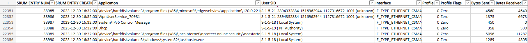 SRUDB.dat을 아예 로우하게 볼 경우 Windows 64-Bit Time Stamp 즉 윈도우 시간이 0x00112233 0x00000000 처럼 분단위까지 정확하게 기록하지 않음. 그래서 srum-dump, srumECmd 등 도구에서 출력할 때 HH:MM:SS 로 초단위까지 출력하지만 분단위까지만 기록 되어있어 초단위가 출력되지 않는다.
