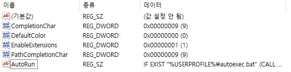regedit 을 이용하여 HKEY_LOCAL_MACHINE\SOFTWARE\Microsoft\Command Processor\AutoRun 에서 데이터를 삽입한다.