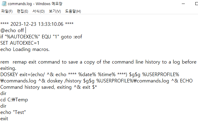doskey /history > 경로\log.txt 명령어를 통해 지금까지 사용한 명령어를 경로\log.txt에 저장하는 방법이다.
