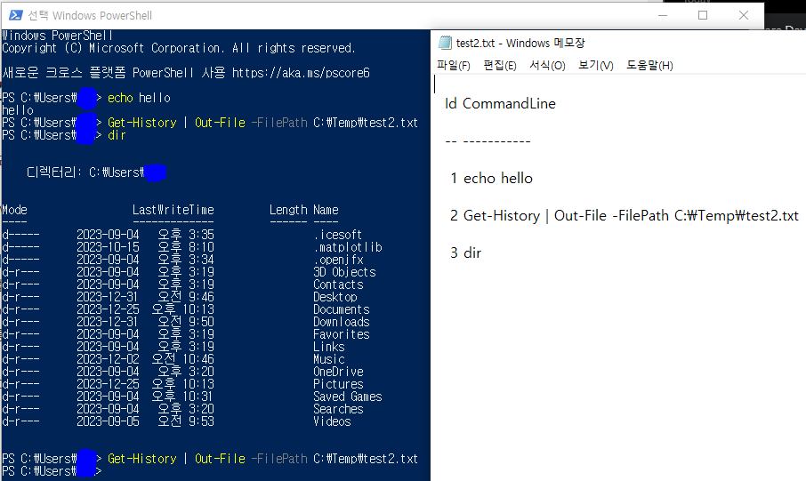 이 또한 위와 비슷하다. Get-History 는 해당 PowerShell에서 사용한 명령어들을 출력하는 명령어로, 이를 이용하여 파일 저장 위치를 지정하여 파일을 저장하는 방법이다.