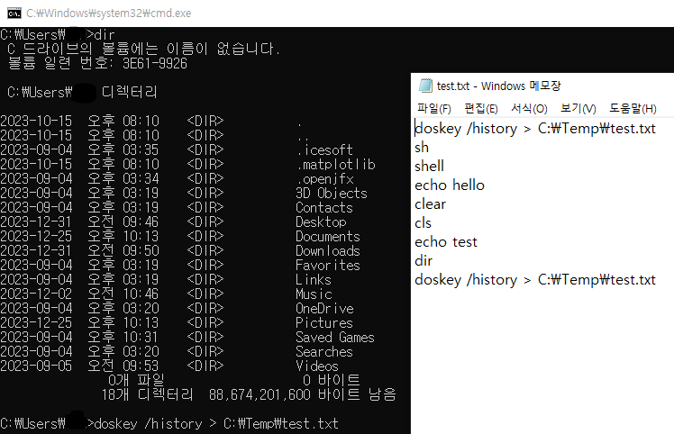 doskey /history > 경로\log.txt 명령어를 통해 지금까지 사용한 명령어를 경로\log.txt에 저장하는 방법이다.