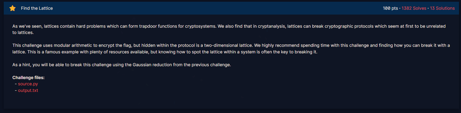 이 도전 과제는 플래그를 암호화하기 위해 모듈러 산술을 사용하지만, 프로토콜 내에는 2차원 격자가 숨겨져 있습니다. 이 도전에 시간을 투자하고 어떻게 격자를 사용하여 이를 깰 수 있는지 찾는 것을 강력히 권장합니다. 이것은 많은 자료가 있는 유명한 예제이지만, 시스템 내에서 격자를 찾아내는 것이 종종 깨는 핵심이 됩니다.
