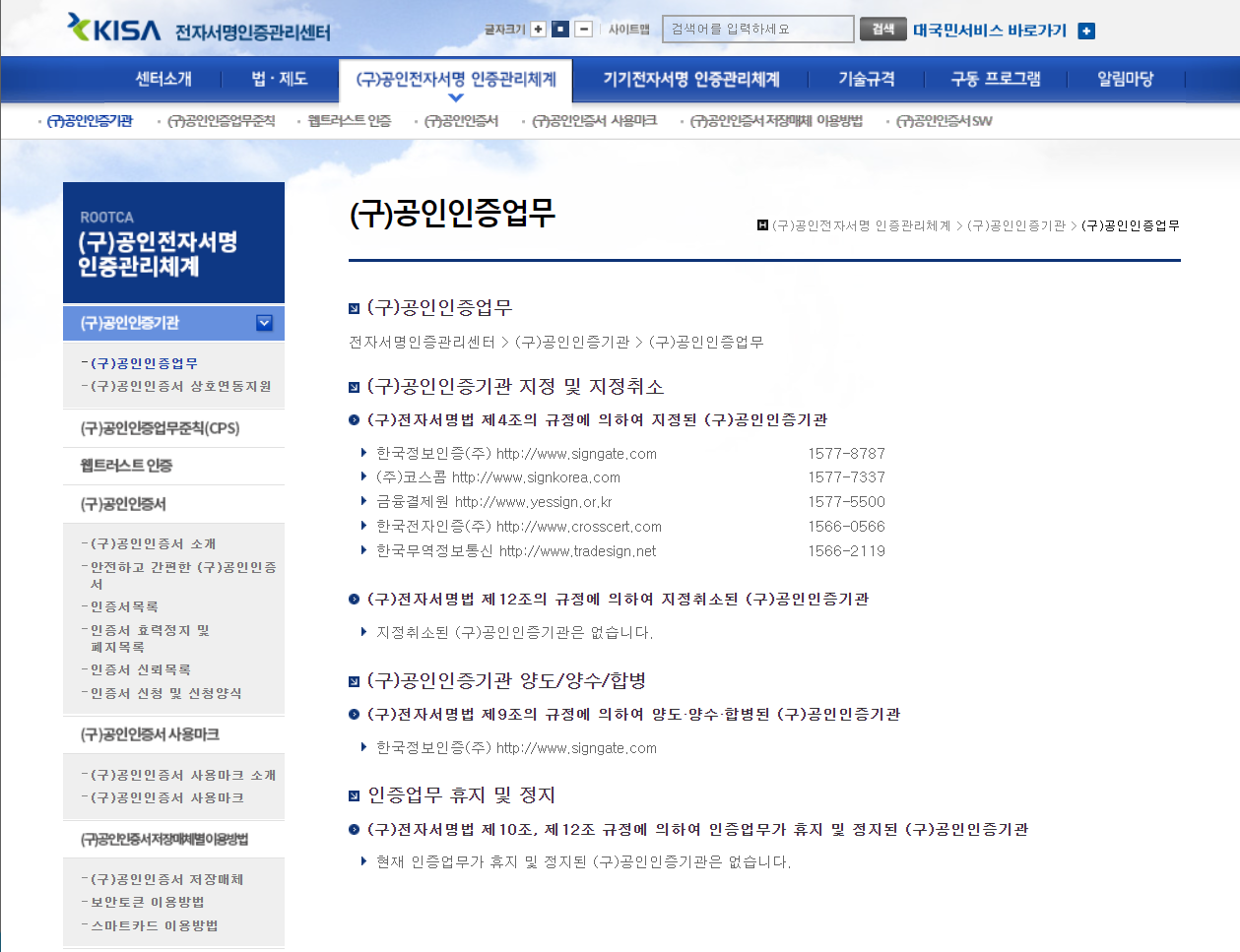 국내에서는 KISA 전자서명인증관리센터에서 공인인증기관에 대한 관리 업무를 담당하고 있다.