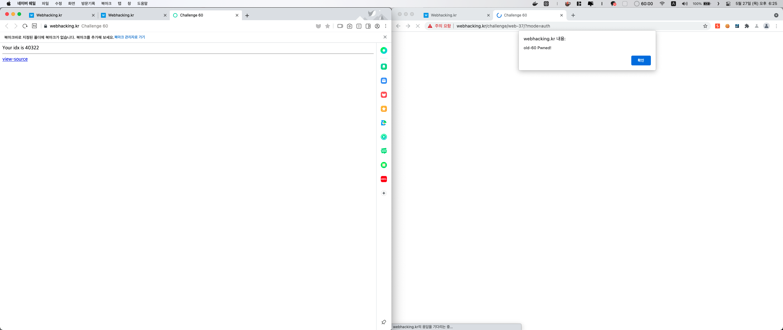 Season 1/워게임 [Webhacking.kr] Old - 60 Write Up 작성자 - LRTK 기능을 알 수 없는 페이지가 나왔다. <?php include "../../config.php"; if($_GET['view_source']) view_source(); login_chk(); echo "Your idx is {$_SESSION['idx']}<hr>"; if(!is_numeric($_COOKIE['PHPSESSID'])) exit("Access Denied<br><a href=./?view_source=1>view-source</a>"); sleep(1); if($_GET['mode']=="auth"){ echo("Auth~<br>"); $result = file_get_contents("./readme/{$_SESSION['idx']}.txt"); if(preg_match("/{$_SESSION['idx']}/",$result)){ echo("Done!"); unlink("./readme/{$_SESSION['idx']}.txt"); solve(60); exit(); } } $p = fopen("./readme/{$_SESSION['idx']}.txt","w"); fwrite($p,$_SESSION['idx']); fclose($p); if($_SERVER['REMOTE_ADDR']!="127.0.0.1"){ sleep(1); unlink("./readme/{$_SESSION['idx']}.txt"); } ?> 코드를 보니, 정해진 text의 내용과 내 세션이 같으면 flag를 획득할 수 있는 것으로 판단된다. 코드를 나눠서 분석을 하였다. if(!is_numeric($_COOKIE['PHPSESSID'])) exit("Access Denied<br><a href=./?view_source=1>view-source</a>"); is_numeric 함수가 뭔지 몰라서 검색하니, 값이 숫자인지를 확인하는 함수였다.위 코드는 쿠키값이 숫자가 아니면, Access Denied를 출력하는 코드였다. PHPSESSID의 값을 1로 변경했더니, Access Denied가 출력이 안되었다. $p = fopen("./readme/{$_SESSION['idx']}.txt","w"); fwrite($p,$_SESSION['idx']); fclose($p); if($_SERVER['REMOTE_ADDR']!="127.0.0.1"){ sleep(1); unlink("./readme/{$_SESSION['idx']}.txt"); } 쿠키 값이 숫자인 상태로 서버에 페이지를 요청하면, IP가 127.0.0.1이 아닌 접속은 1초 뒤에 생성된 세션이 들어있는 파일을 삭제한다. sleep(1); if($_GET['mode']=="auth"){ echo("Auth~<br>"); $result = file_get_contents("./readme/{$_SESSION['idx']}.txt"); if(preg_match("/{$_SESSION['idx']}/",$result)){ echo("Done!"); unlink("./readme/{$_SESSION['idx']}.txt"); solve(60); exit(); } 쿠키값이 숫자인 채로 Get메소드로 mode=auth를 넘기면, 세션이 들어있는 파일을 읽어서 현재 세션과 같으면 Flag를 출력한다. 나는 1초라는 시간을 이용하기로 하였다.두 개의 브라우저 세션 쿠키를 숫자로 변경하여, 웨일이 문제 페이지에 접속하여 파일을 생성 후 1초라는 로딩 시간동안 크롬에선 서버에 Get메소드로 ?mode=auth를 전달하여 웨일 때문에 생성된 파일을 읽어들어서 Flag를 획득하였다. 이러한 방법이 레이스 공격이다. 공유하기 게시글 관리 MSS 'Season 1 > 워게임' 카테고리의 다른 글 [Webhacking.kr] Old - 3 Write Up (0) 2021.05.28 suninatas/웹/3번 문제풀이 (0) 2021.05.28 [Webhacking.kr] Old - 49 Write Up (0) 2021.05.27 [Webhacking.kr] Old - 46 Write Up (0) 2021.05.27 [Webhacking.kr] Old - 11 Write Up (0) 2021.05.27 Contents 당신이 좋아할만한 콘텐츠 [Webhacking.kr] Old - 3 Write Up 2021.05.28 suninatas/웹/3번 문제풀이 2021.05.28 [Webhacking.kr] Old - 49 Write Up 2021.05.27 [Webhacking.kr] Old - 46 Write Up 2021.05.27 댓글 0 + 이전 댓글 더보기