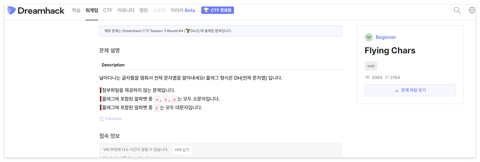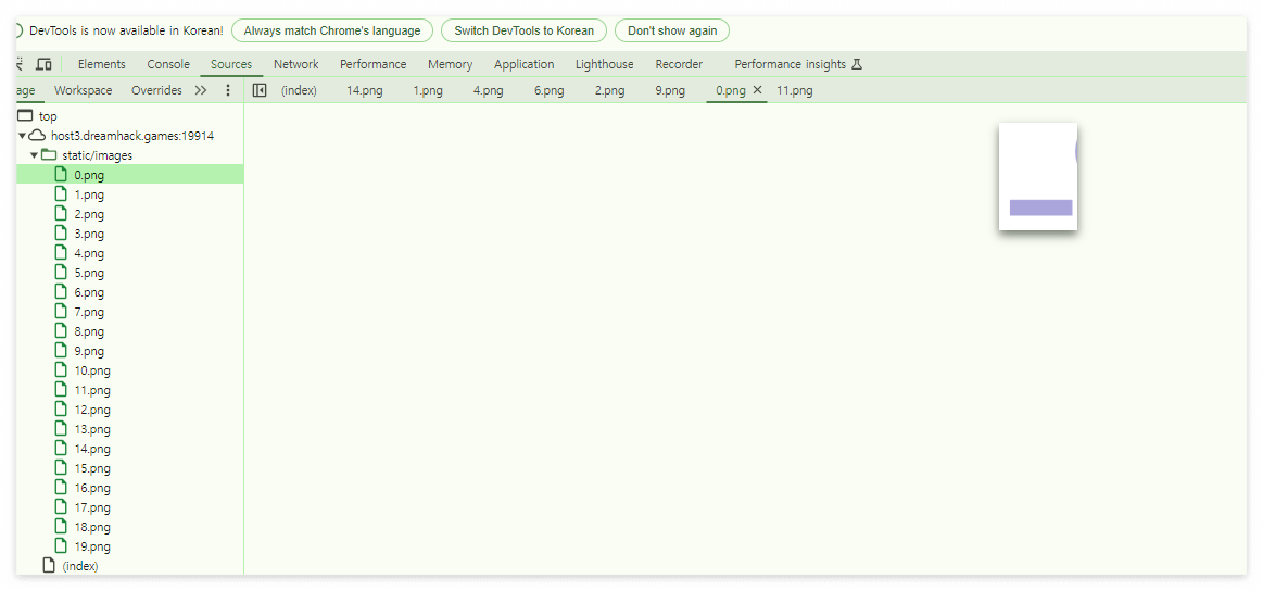 Season 1/워게임 [DreamHack] Flying Chars 작성자 - 현우는 5살 Flying Chars 목차 문제 풀이 과정 결과 문제 문자가 날아다닌다는데, 웹 사이트를 확인해볼 경우 웹사이트에 단어가 미친듯이 움직이는것을 확인할 수 있습니다. 그래서 움직이지 않게 하거나,이미지를 하나하나 확인해보면 될것 같다는 생각을 했습니다. 풀이과정 웹사이트의 이미지 파일을 확인해볼 경우 단어들을 확인할 수 있습니다. 이제 순서만 확인하면 되는데, 순서를 확인하는것은 어려운일이 아니다. 이 웹사이트의 코드를 확인해볼 경우 const img_files = ["/static/images/10.png", "/static/images/17.png", "/static/images/13.png", "/static/images/7.png","/static/images/16.png", "/static/images/8.png", "/static/images/14.png", "/static/images/2.png", "/static/images/9.png", "/static/images/5.png", "/static/images/11.png", "/static/images/6.png", "/static/images/12.png", "/static/images/3.png", "/static/images/0.png", "/static/images/19.png", "/static/images/4.png", "/static/images/15.png", "/static/images/18.png", "/static/images/1.png"]; 이러한 코드를 봐서 이미지의 순서가 10, 17, 13, 7, 16, 8, 14, 2, 9, 5, 11, 6, 12, 3, 0, 19, 4, 15, 18, 1이라는 것을 확인할 수 있습니다. 결과 이미지를 순서대로 확인할 경우, flag값이 나와 답을 확인할 수 있습니다 공유하기 게시글 관리 MSS 저작자표시 비영리 (새창열림) 'Season 1 > 워게임' 카테고리의 다른 글 XSS Filtering Bypass (0) 2024.05.31 [pwnable] shell_basic 문제풀이 (0) 2024.05.26 [CryptoHack] MISC(Armory) (0) 2024.03.31 [dreamhack] ROT128 문제풀이 (0) 2024.01.31 [CryptoHack] MISC(Bit by Bit) (0) 2024.01.31 Contents 당신이 좋아할만한 콘텐츠 XSS Filtering Bypass 2024.05.31 [pwnable] shell_basic 문제풀이 2024.05.26 [CryptoHack] MISC(Armory) 2024.03.31 [dreamhack] ROT128 문제풀이 2024.01.31 댓글 0 + 이전 댓글 더보기