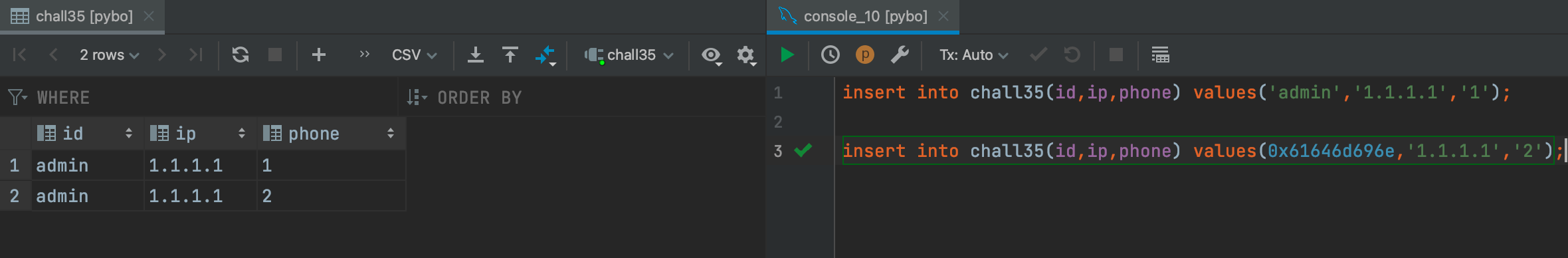 나는 insert into chall35(id,ip,phone) values(‘{$_GET[‘id’]}’,’{$_SERVER[‘REMOTE_ADDR’]}’,{$_GET[‘phone’]})를 통해 admin을 삽입하고자 하였다.