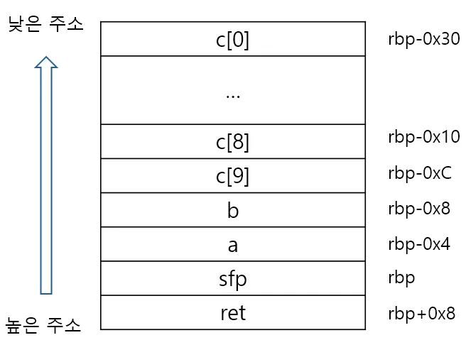 b. 변수 `a`, `b`, 배열 `c[b]`는 `int` 형이며, 각각 4 byte 크기로 스택에 연속적으로 배치됨
