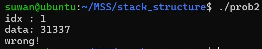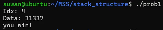 e. 따라서 사용자 입력으로 `Idx: 4`, `data: 31337`을 넣으면, `c[11] == 31337`이 되어 변수 `a`를 덮을 수 있고, 이후 `if (a == 31337)` 조건이 참이 되어 `you win!`이 출력됨