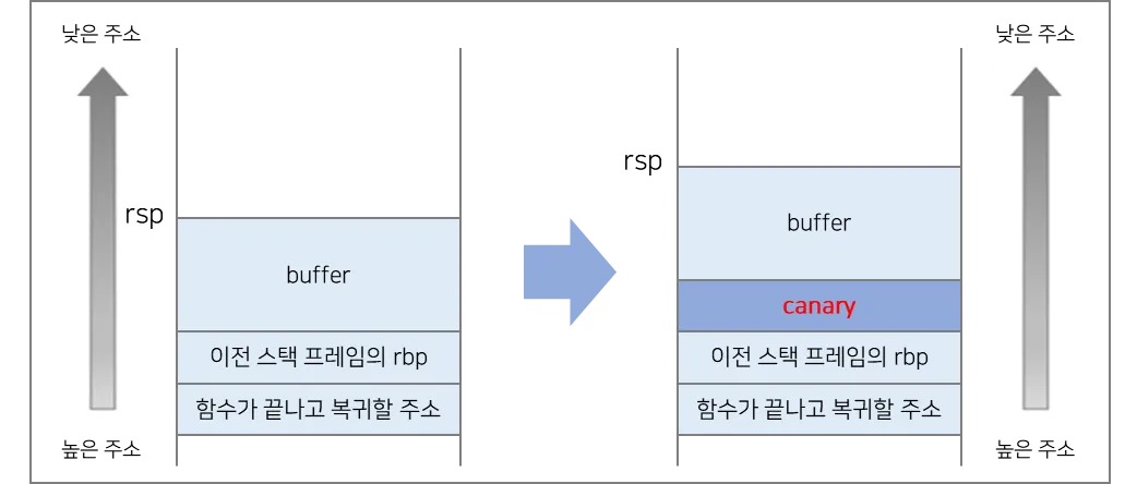 - 스택 오버플로우 취약점을 방지하기 위한 보호 메커니즘으로, 버퍼와 SFP(Stack Frame Pointer) 사이에 `스택 카나리(Canary)`라는 무작위 값을 삽입함