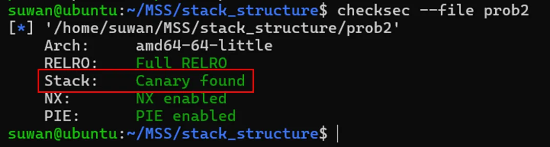- 스택 보호(Stack Smashing Protector) 기능이 자동으로 활성화됨