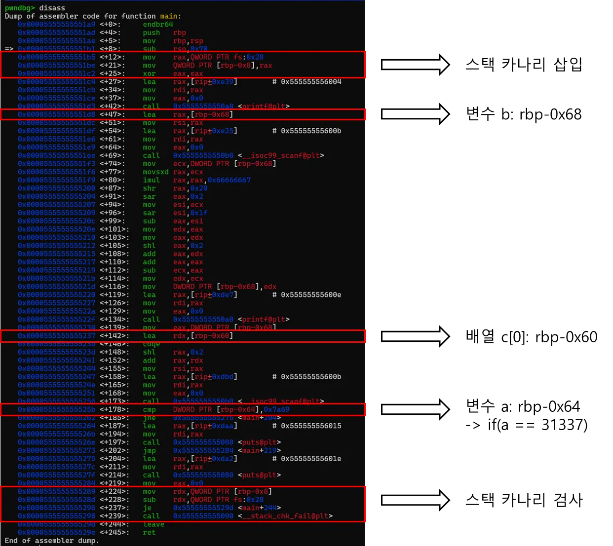 4. 배열 `c[b]`를 통해 스택에 있는 변수 `a`의 값을 `31337`로 덮어쓰기