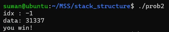 c. 따라서 사용자 입력으로 `idx: -1`, `data: 31337`을 넣으면, `c[-1] = 31337`이 되어 변수 `a`를 덮을 수 있고, 이후 `if (a == 31337)` 조건이 참이 되어 `you win!`이 출력됨