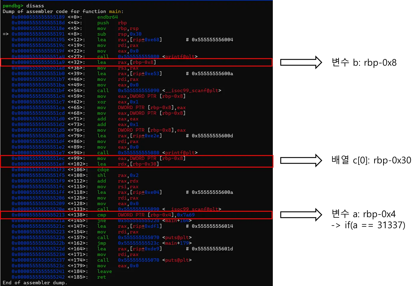 3. 배열 `c[b]`를 통해 스택에 있는 변수 `a`의 값을 `31337`로 덮어쓸 수 있다면, 조건문 `if(a == 31337)`을 만족시켜 `you win!`을 출력할 수 있음