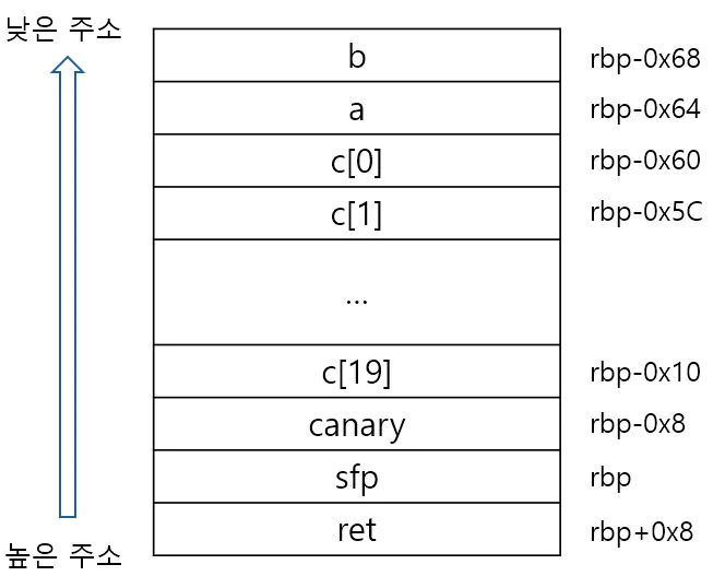 b. 배열 `c`는 `int`형으로 연속된 공간에 저장되므로, `c[-1]`은 `rbp-0x60-0x4 = rbp-0x64`를 가리키게 됨
