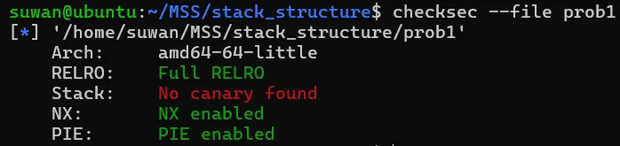 a. 분석 대상 파일은 64 bit 환경의 ELF 파일이며, 스택 보호 기능이 활성화되어 있음