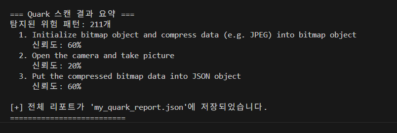 이제 저같은 경우에는 quarkengine에서 제공하는 모든 rule들을 사용하여 모바일앱 취약점 점검 기능을 진행하는 모듈을 개발하였습니다. 추후에 버그바운티와 같은 활동을 진행할때 이와같이 위험도를 측정한 후에 이에 관련된 취약점 위주로 트리거를 찾는다면, 보다 쉽게 취약점 점검을 진행할 수 있을거 같습니다.