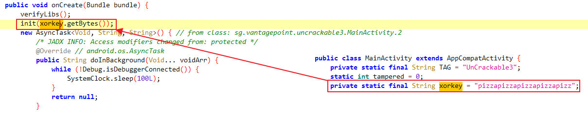 - MainActivity에서 init 함수 호출 시 xorkey를 통해 연산 확인