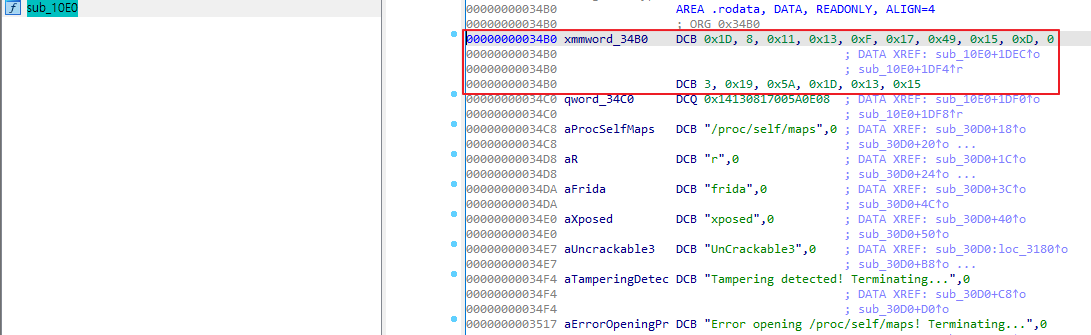 - sub_10E0 함수 : secret string으로 해당 함수의 v8을통해 받아오는 것을 확인