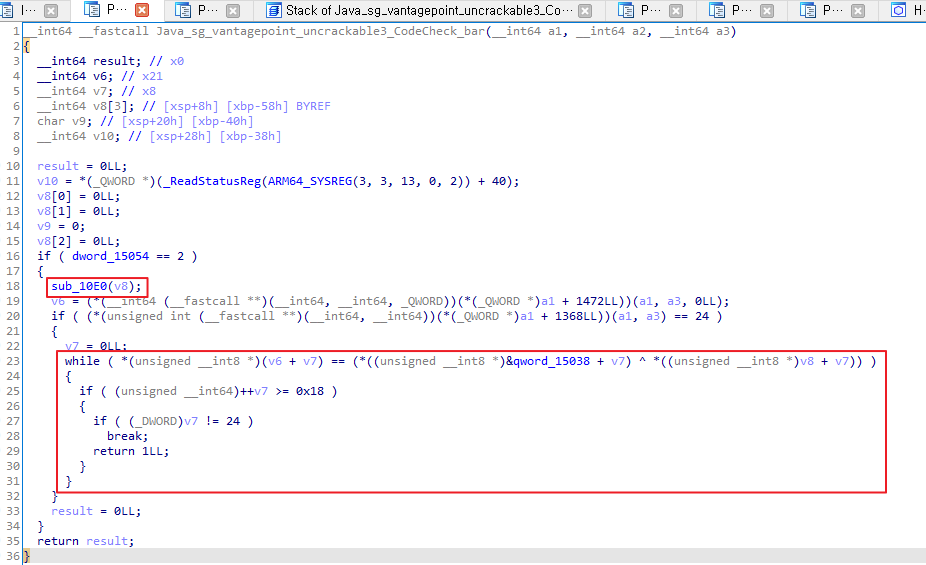 - sub_10E0 함수 : secret string으로 해당 함수의 v8을통해 받아오는 것을 확인