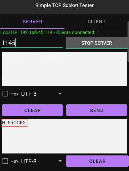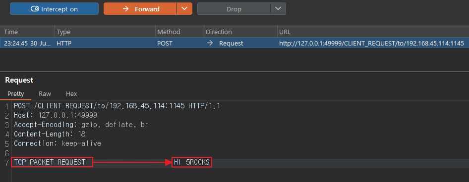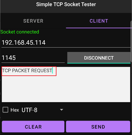 STEP 1) TCP PACKET 테스트용 앱을 통해 "TCP PACKET REQUEST" 데이터 전송