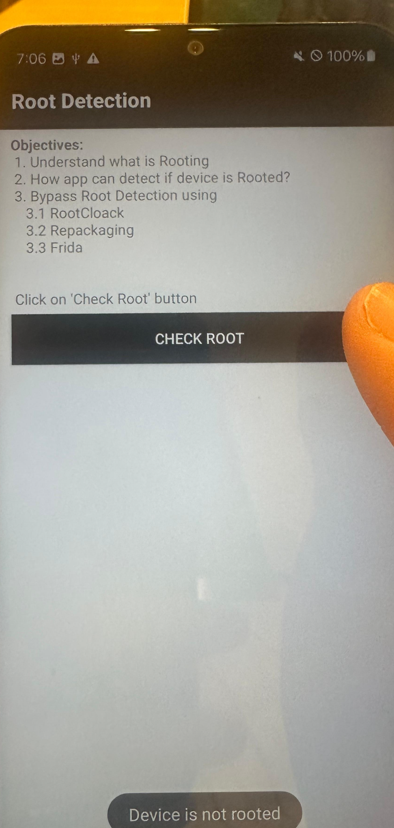 먼저 CheckRoot버튼을 눌러 확인해본 결과 Device is rooted라는 토스트와 함께 루팅이 탐지되었다는 사실을 확인할 수 있습니다.