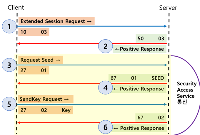 - Security Acess 서비스는 외부 사용자의 ECU 내부 데이터 및 진단 서비스의 접근 권한을 제어한다. 보안 표준에 위배 되는 루트 접근 시도를 하거나 부적절한 데이터를 다운로드하게 되면 ECU나 차량 내부 구성 요소를 손상 시켜 운전자의 안전을 위협할 수 있다. 때문에 외부 사용자는 Security Access 서비스를 통해 보안 엑세스 권한을 받은 후 ECU의 내부 데이터를 수정, 삭제 또는 업데이트를 할 수 있어야 한다.