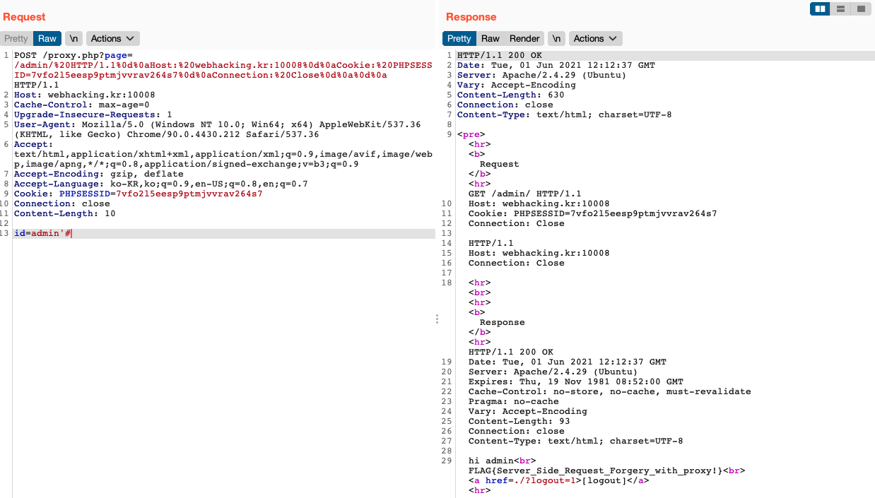 이를 통해 문제 서버의 프록시를 이용하여, admin 페이지에 주요 헤더와 데이터들을 보냈다.