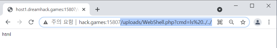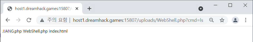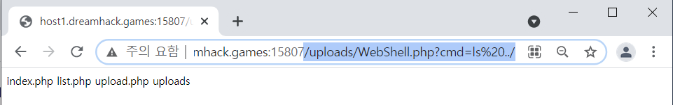 이제 웹쉘이 업로드된 경로에 GET으로 cmd 파라미터에 ls 명령어를 전송해서 flag.py를 찾아보자.