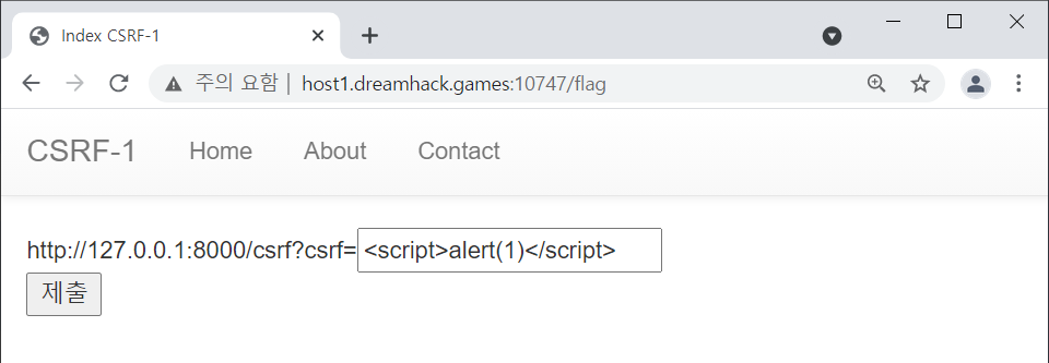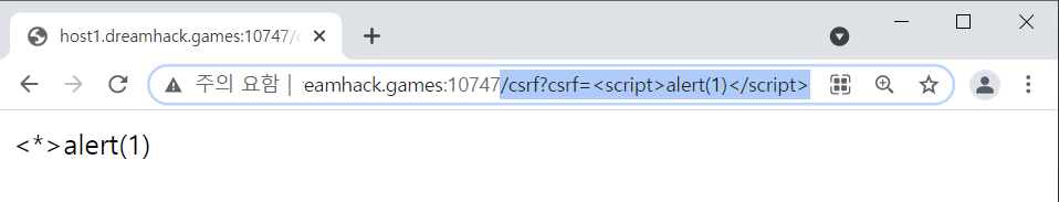 csrf 페이지에 접속하면 csrf 파라미터로 alert(1)를 실행하는 스크립트 구문을 전달한다.