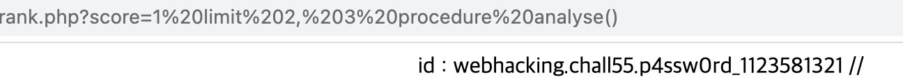 나는 "flag의 자리를 암시하는 것이 아닐까?"라는 생각을 할 수 있었고, 만약 페이지에 표시해주기 위해서는 "SELECT id, flag, score FROM chall55 WHERE score=score파라미터으로 이루어지지 않았을까?"라는 생각으로 이어졌다.